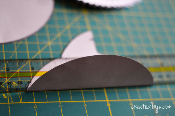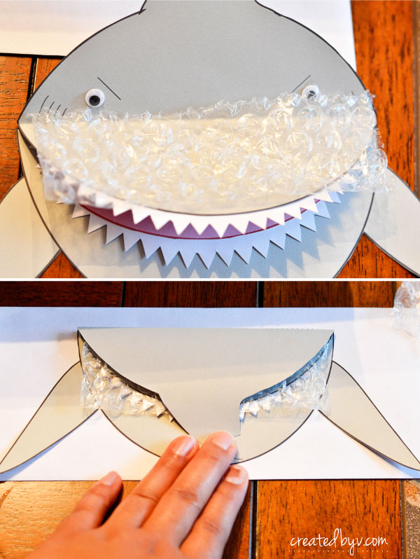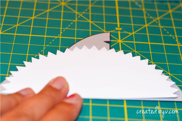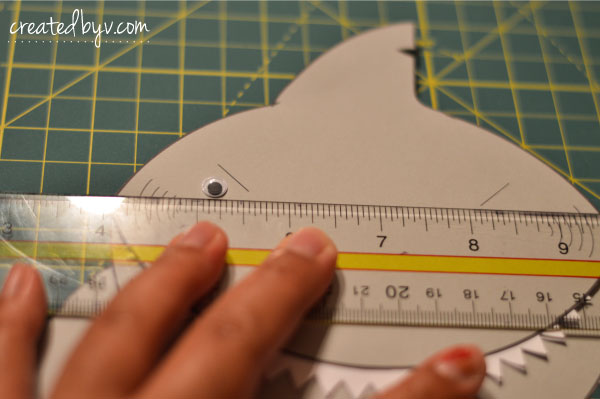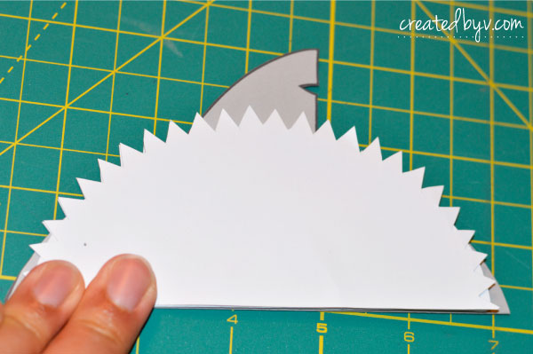 Get comfy in front of the television with your favorite show on DVR because it will require some time and patience to cut these little guys out. The templates have thick outlines, which provide some leniency when cutting by hand. The teeth are the most tedious, but they are so worth the blisters. I experimented with zig-zag scissors, but it didn’t deliver a sharp enough ‘bite.’ These teeth scream, “Shaaark!” so don’t skimp on this step. Take your time, spread the cutting out over a few nights and enlist the help of a friend or two.